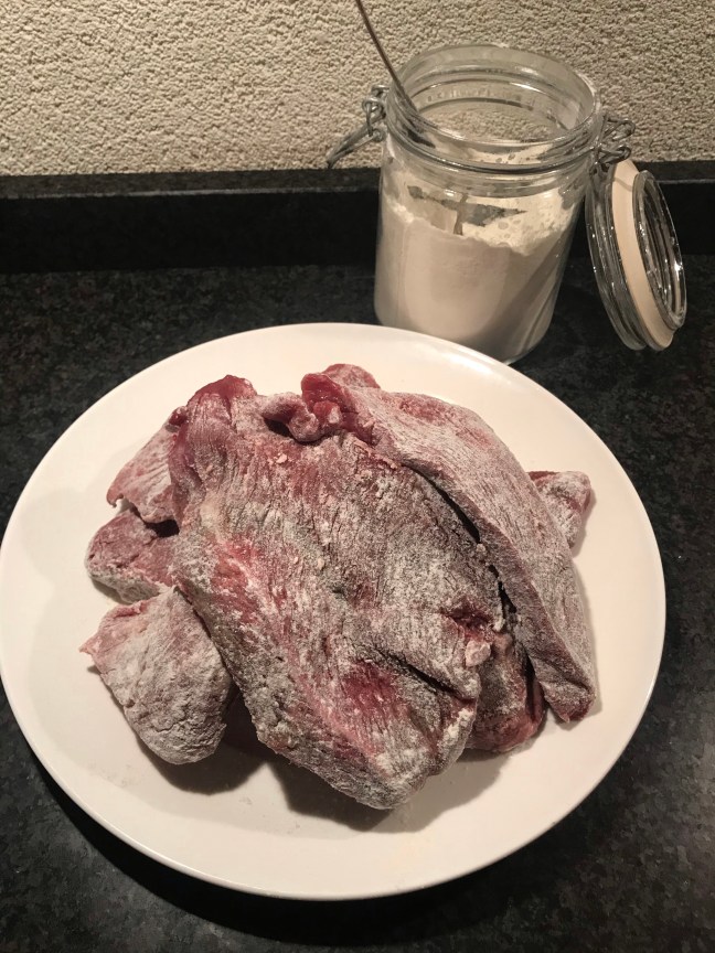 Wrijf het vlees in met bloem, peper en zout.
