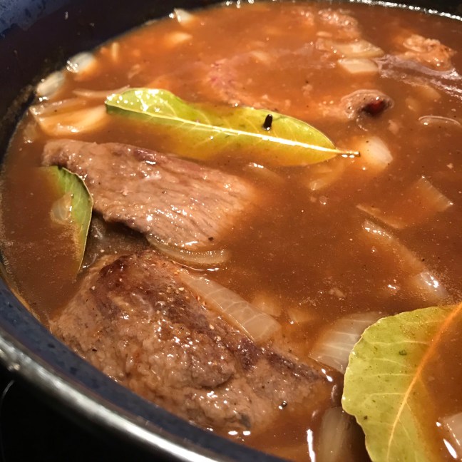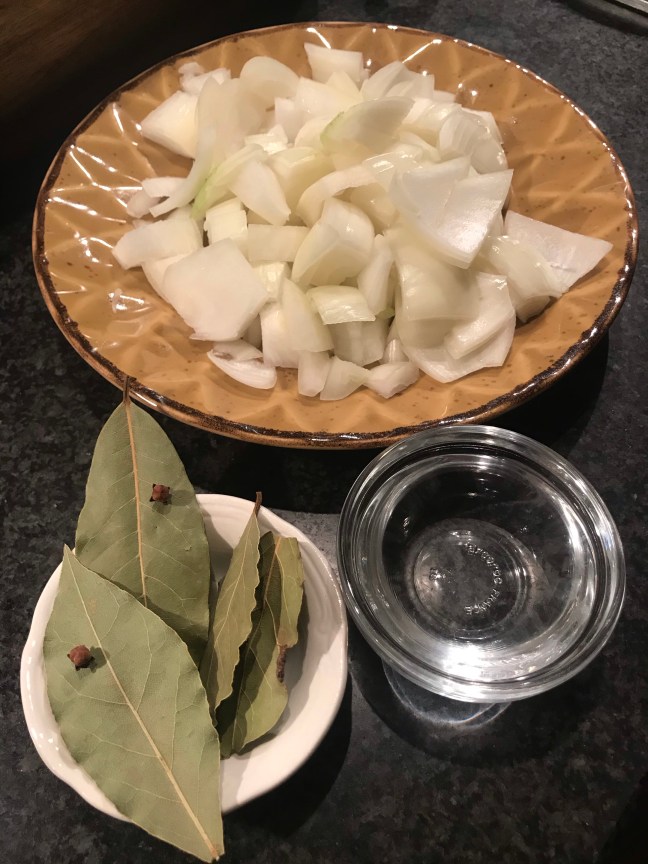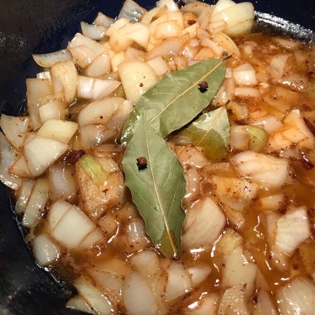 Doe het water, de bouillonblokjes , de azijn, de laurierblaadjes, de kruidnagels bij de gefruite ui in de braadpan en breng de inhoud van de pan aan de kook.