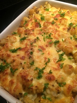 Bestrooi het gehaktmengsel indien gewenst met extra peper en zout. Giet de bloemkoolroosjes af en meng ze met de voorgekookte ( 5 min) mini krieltjes bij het gehakt-groentemengsel.