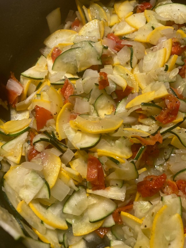 Verhit olie in een braadpan en bak de courgette en ui ( zongedroogde tomaatjes )ca. 5 min. zachtjes.