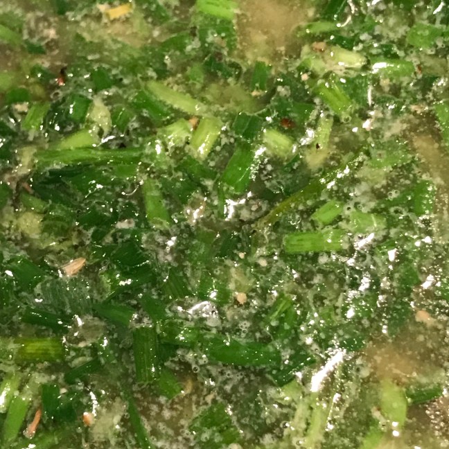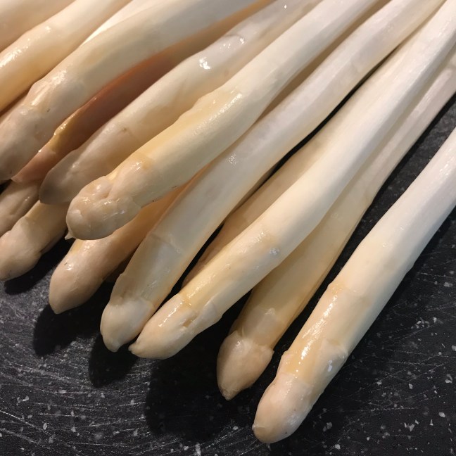 Schil de asperges vanaf vlak onder het kopje naar beneden en verwijder de houtachtige onderkant. Snijd er vervolgens lange linten van met een dunschiller.