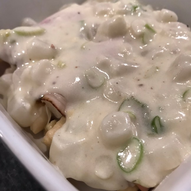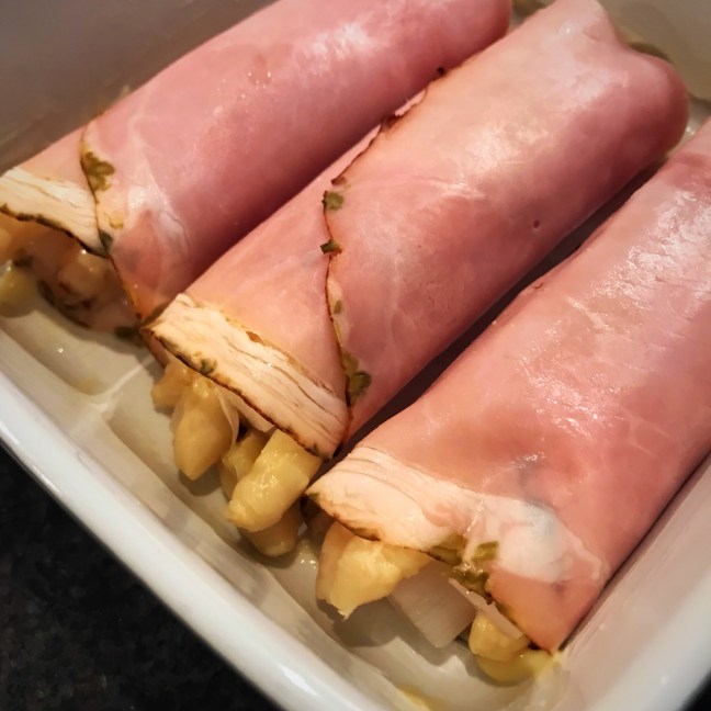 Doe de blokjes asperge erbij en maak op smaak af met zout en peper. Giet de saus over de asperge hamrolletjes en strooi de Parmezaanse kaas erover.