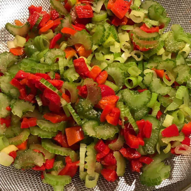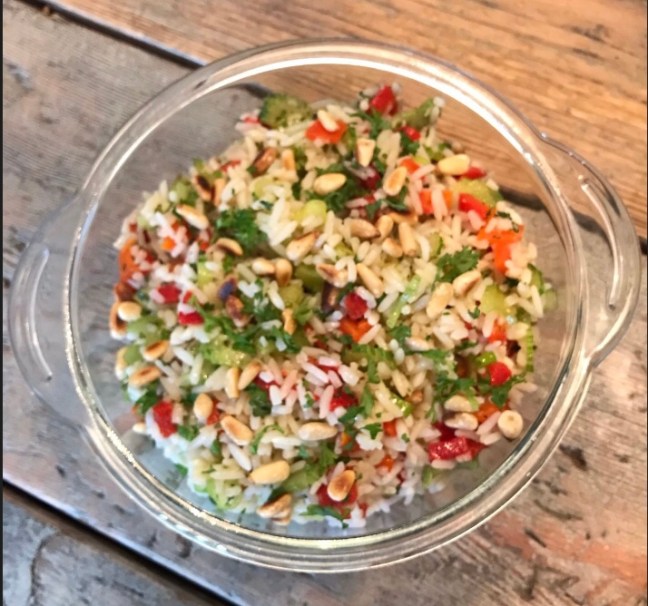 Schep de gesneden bleekselderij, ui ringetjes en paprika voorzichtig door de gare rijst en laat het gerecht afkoelen.