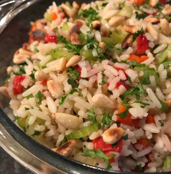 Schep de rijst en de pijnboompitten luchtig door de dressing.