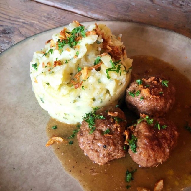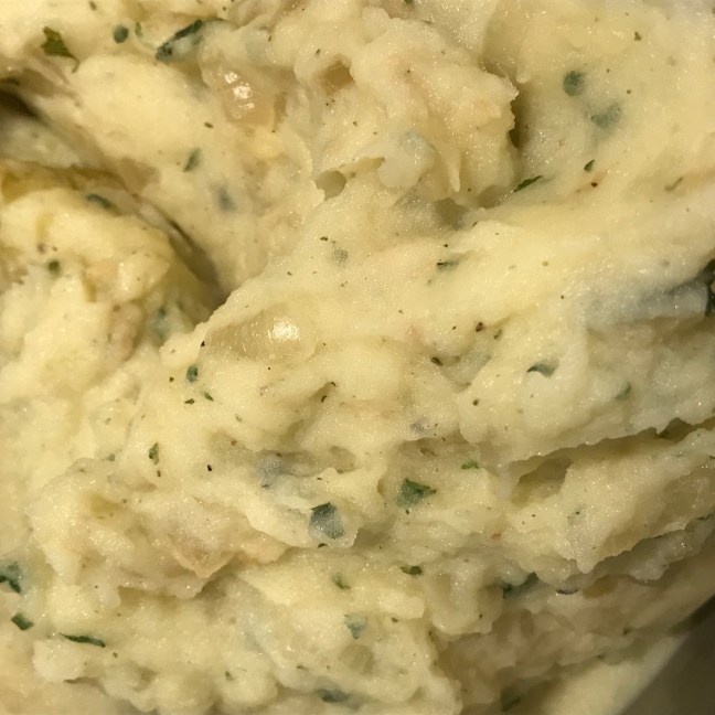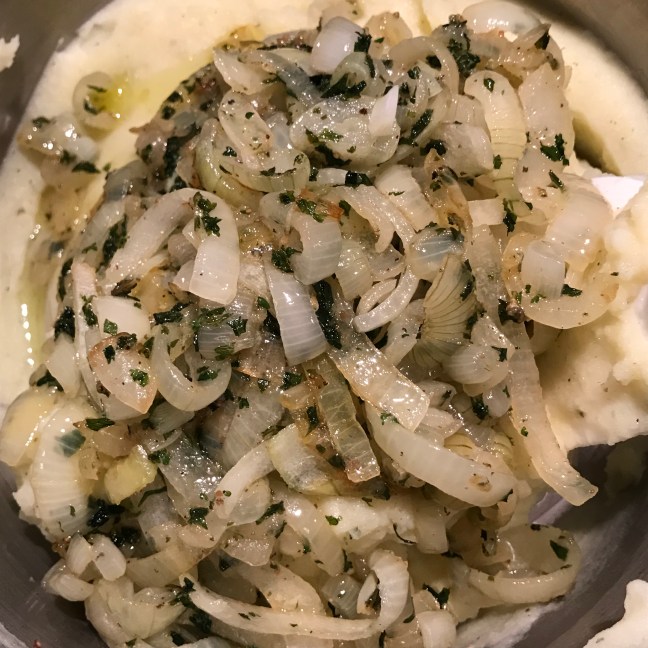 Schep de uien en het braadvet bij de gestampte aardappelen.