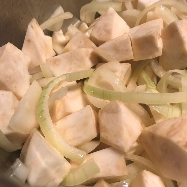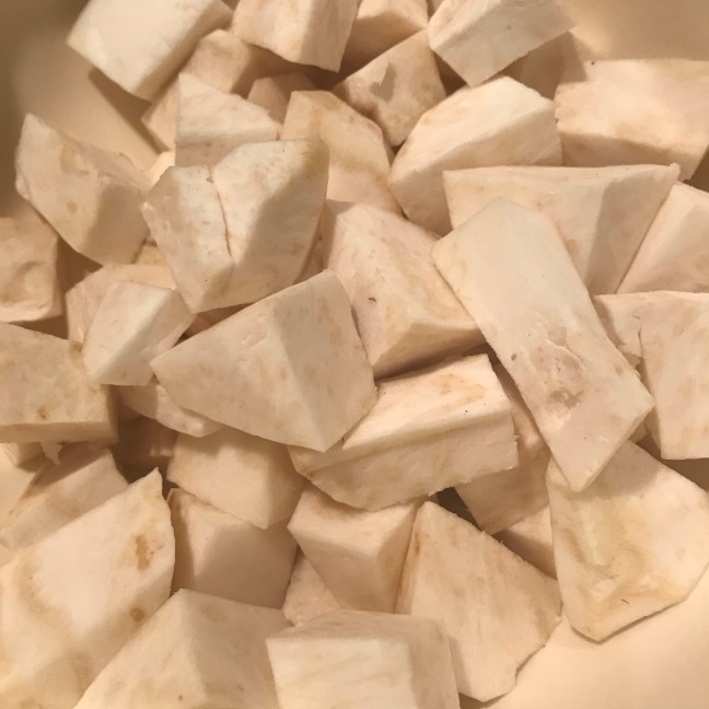 Schil de knolselderij en snijd in stukken van 2 cm.
