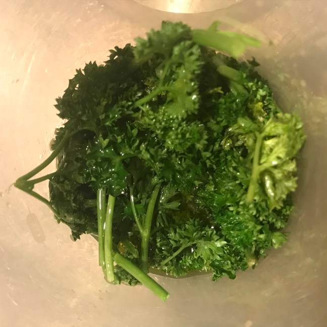 Snijd ondertussen de peterselie grof, doe met de olie en