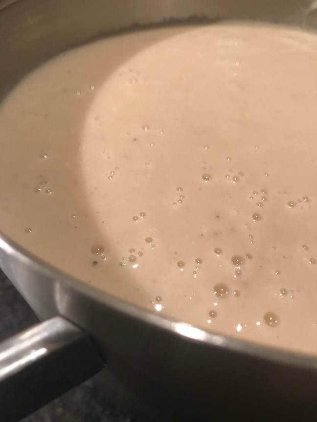 Voeg de slagroom toe, breng op smaak met peper en eventueel zout en verwarm 5 min. op laag vuur.