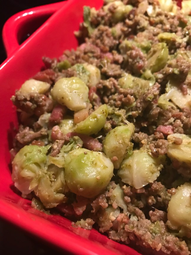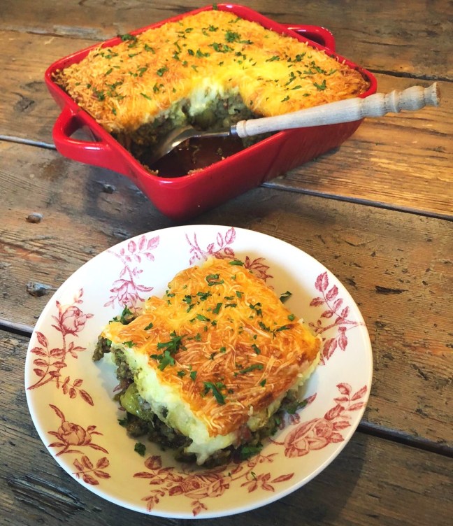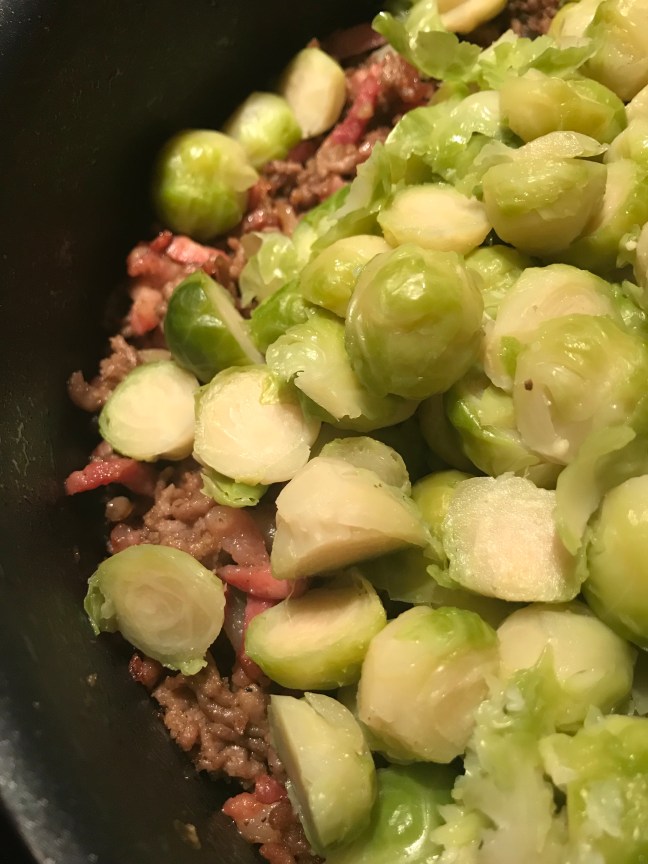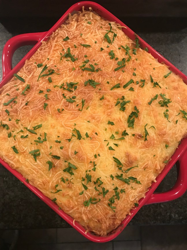 Ovenschaal vullen met gehakt/ spruitenmengsel en een als laatste de puree erover verdelen.