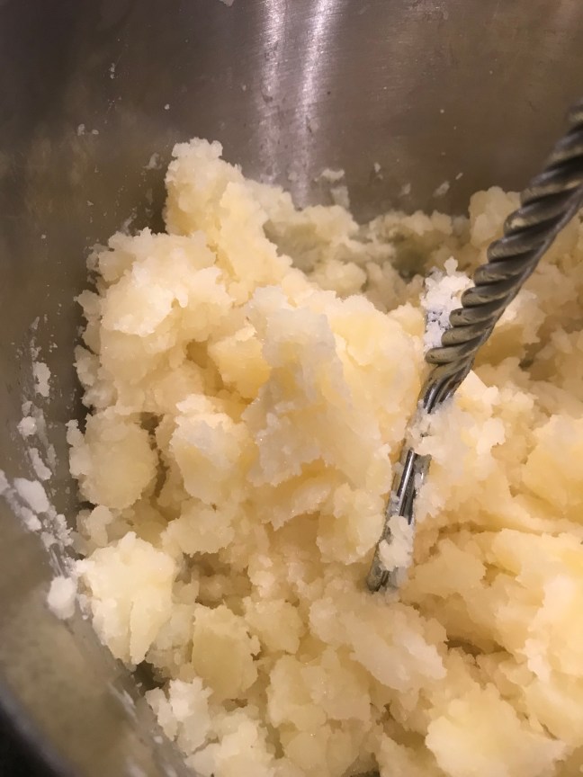 Aardappels afgieten en puree maken met boter en melk , zodat je een smeuïge puree krijgt.