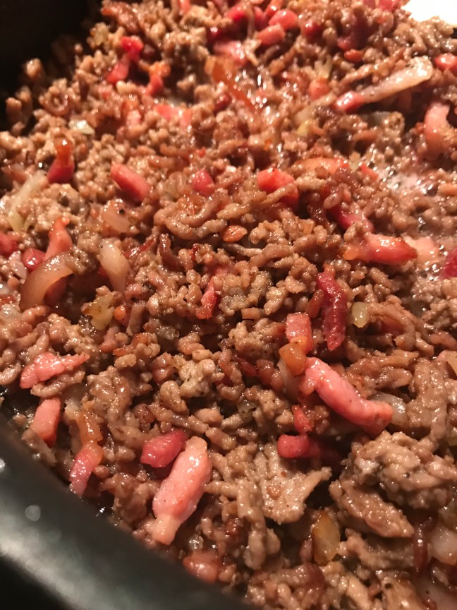 Ui aanfruiten in een hapjespan , spekjes toevoegen en uitbakken.