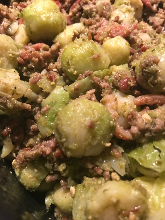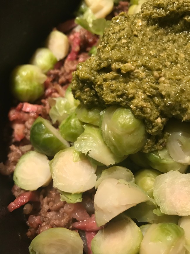 Spruitjes afgieten en samen met de pesto door het gehaktmengsel scheppen.