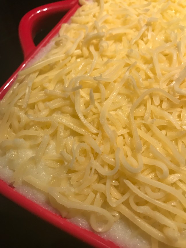 Bestrooi met geraspte kaas en zet het gerecht in een voorverwarmde oven , ca. 15 min , totdat er een mooi kaaskorstje ontstaat.