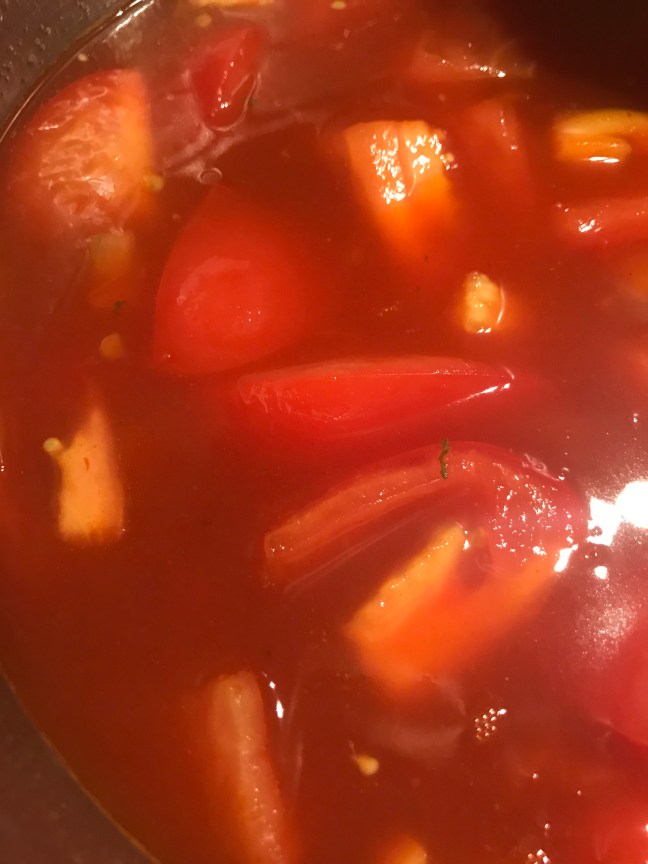 Pan terug op het vuur en laat de tomatensoep nog een paar minuutjes doorkoken.