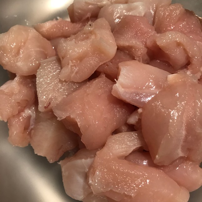 Verwarm dit tot medium hitte en gaar hierin de stukjes kip, ui en paprika gedurende zo’n 15 minuten.