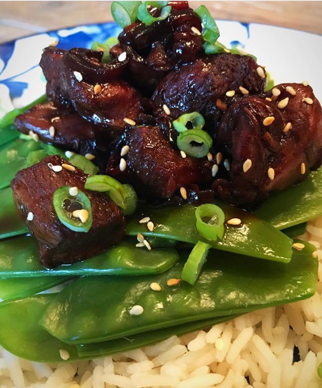 Serveer de kip ketjap op een bedje rijst met bijv. peultjes.