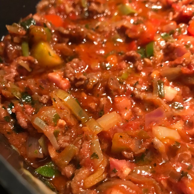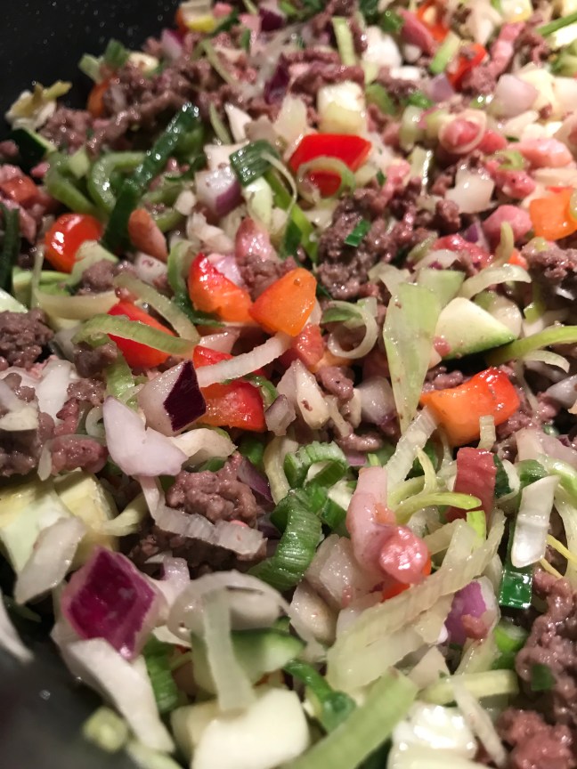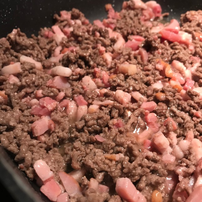 Gehakt rul bakken , spekjes en roerbakgroente erbij , geheel ca. 5 min op middelhoog meebakken.