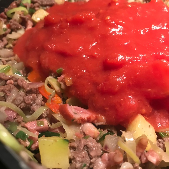 Tomatenblokjes , passata , fijngesneden knoflook en Italiaanse kruiden toevoegen.