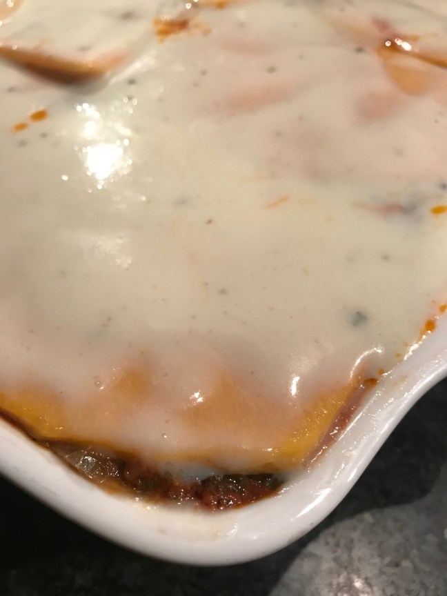 Verdeel de bechamelsaus over de lasagne en zet deze gedurende 45 – 50 min. in een voorverwarmende oven van 200 graden.