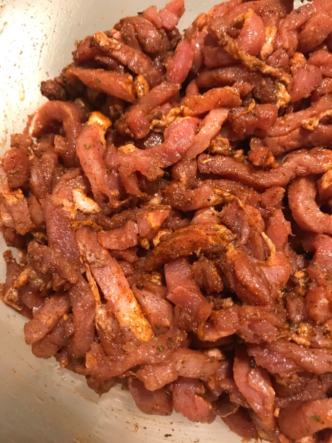 Vlees kruiden met de gyroskruiden en 2 el zonnebloemolie.