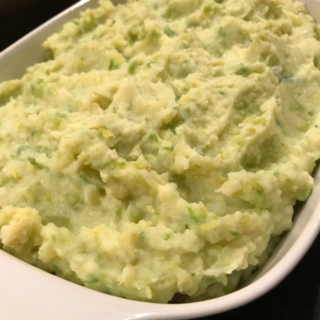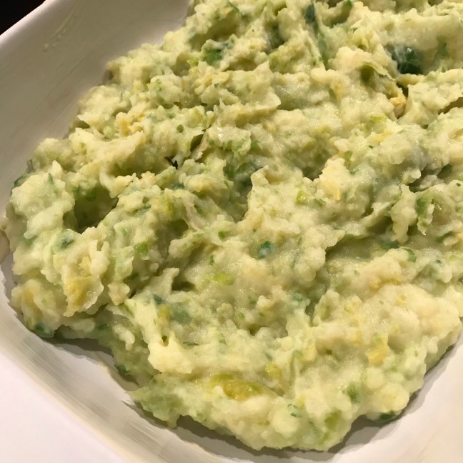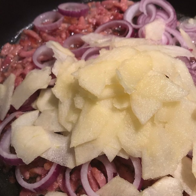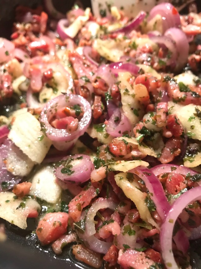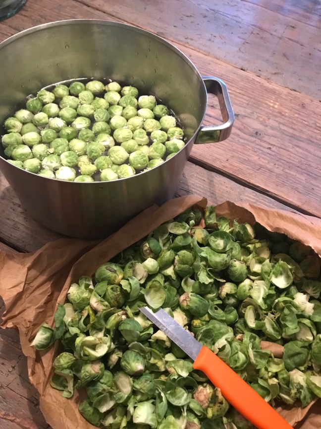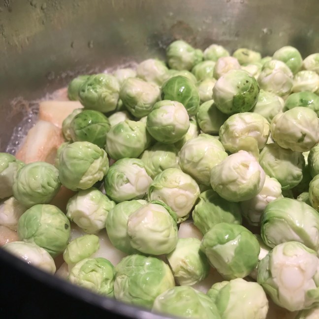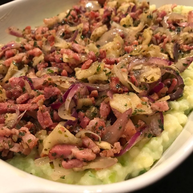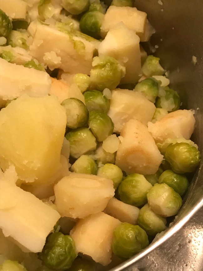 Pastinaak – Spruitjes Stamppot , met gebakken spekjes en appel.