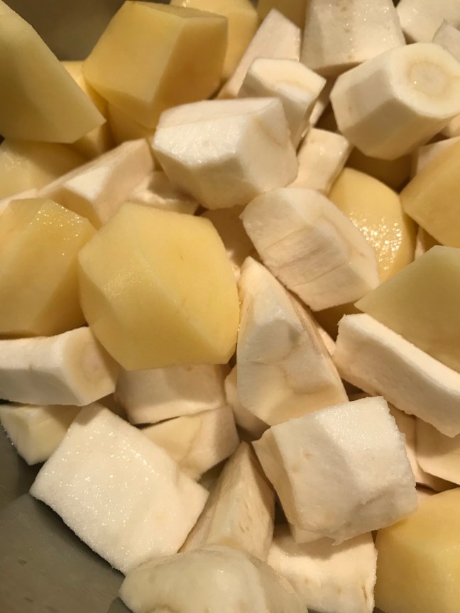 Schil de aardappelen, de pastinaak en snijd in gelijke stukken.