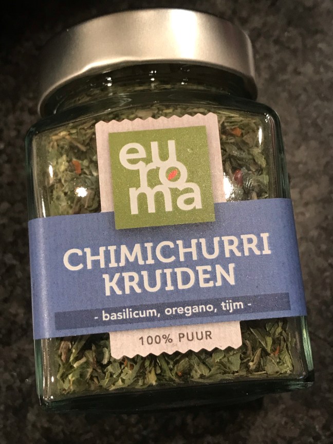 Verhit ondertussen een koekenpan en bak hierin de spekjes uit , voeg de ui , appel en chimichurrie kruiden toe en bak het mengsel nog 1 minuutje.