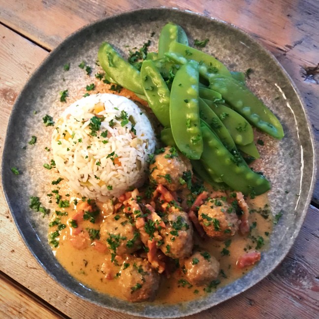Gehaktballetjes in mosterdsaus met notenrijst en peultjes
