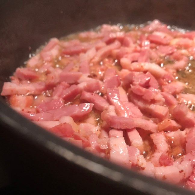 Voeg de spekjes en peper bij het braadvocht in de pan, even goed aanbakken.