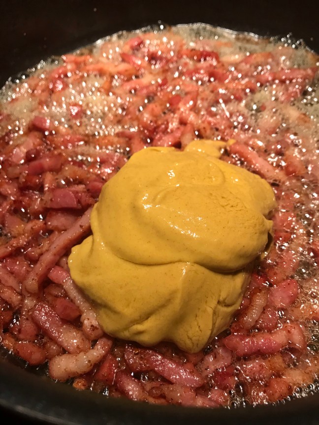 Voeg de mosterd toe en de bouillon en roer goed met een garde en breng de inhoud van de pan aan de kook.