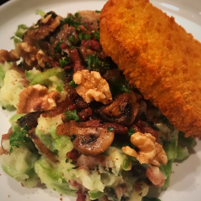 Snijbonenstamppot met champignons,spekjes en walnoten