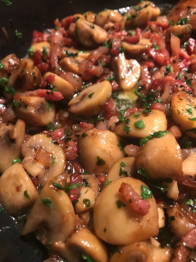 Voeg champignons , ui en peterselie toe en bak ze 5 min. mee.