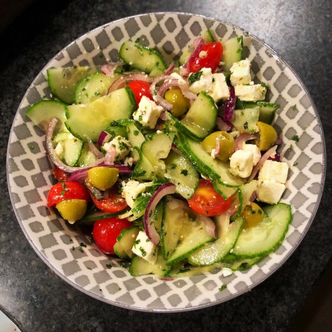 Komkommer , tomaat , rode ui , olijven , feta , olijfolie en versgemalen peper.