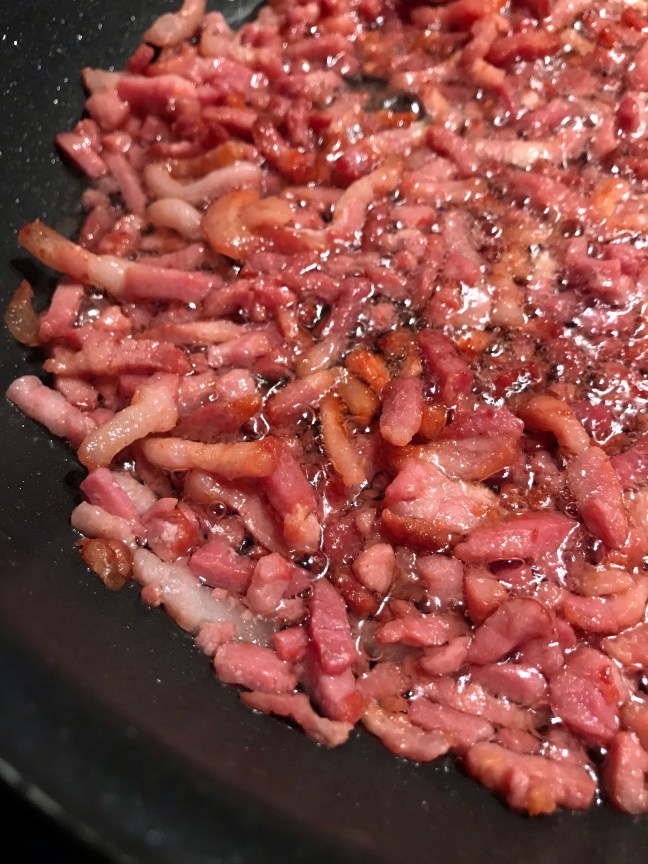 In een andere pan spekjes uitbakken, kastanjechampignons ,