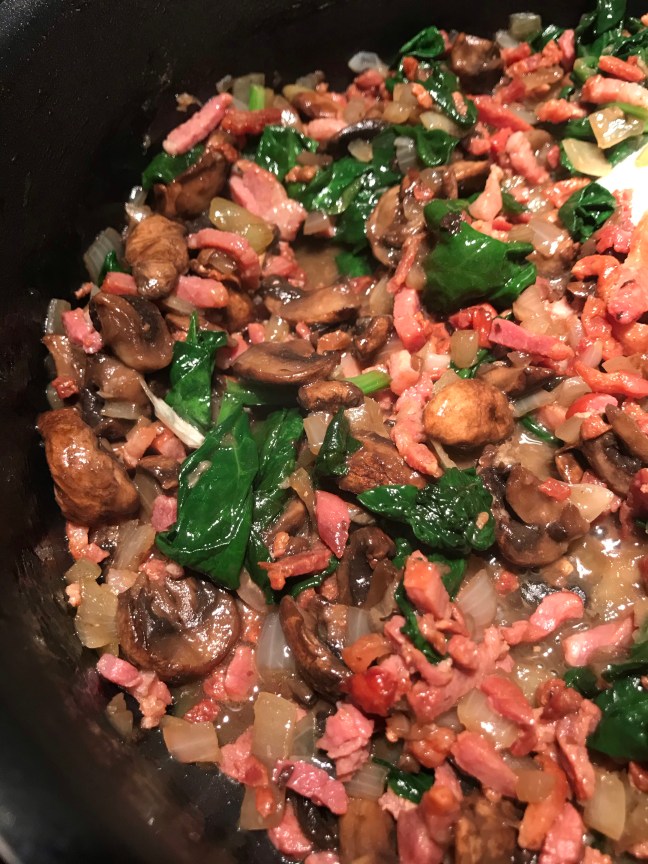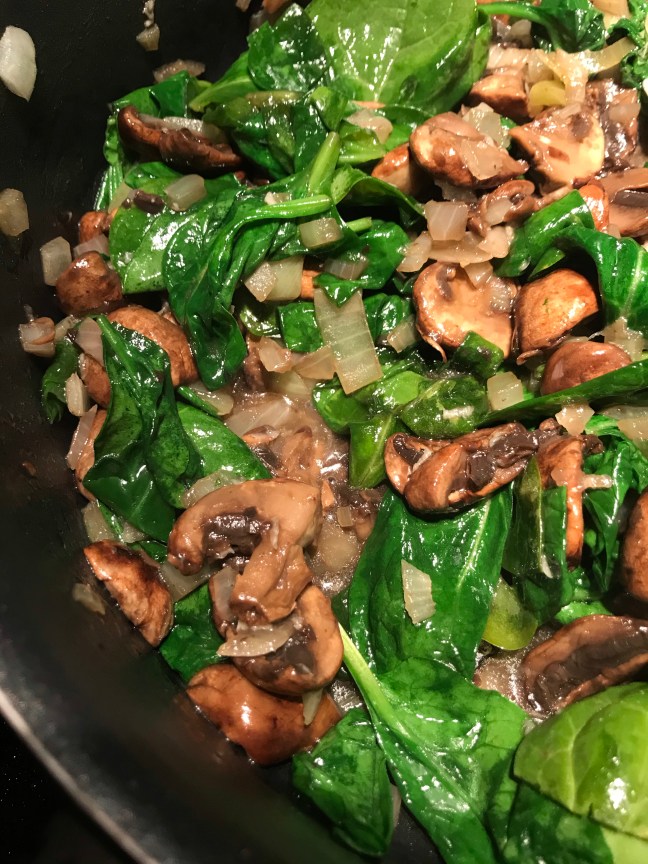 ui en knoflook erbij en even meebakken , spinazie er beetje bij beetje erbij en meebakken totdat deze geslonken is.