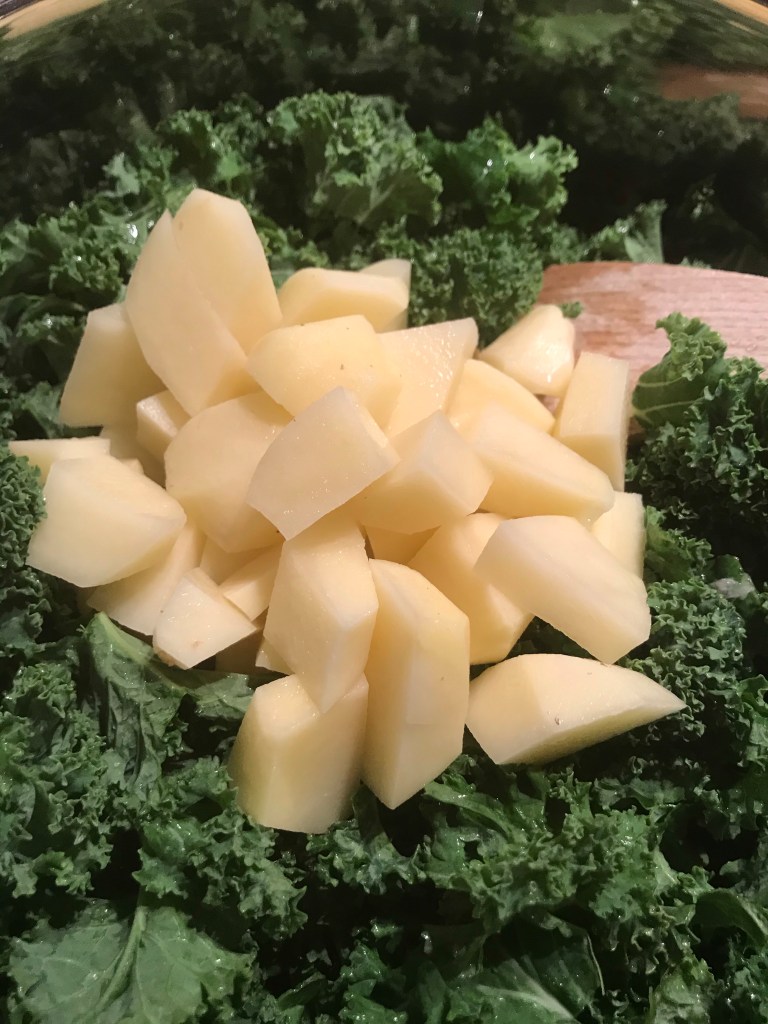 Schep de aardappelblokjes en boerenkool door de ui en schenk de bouillon erbij.