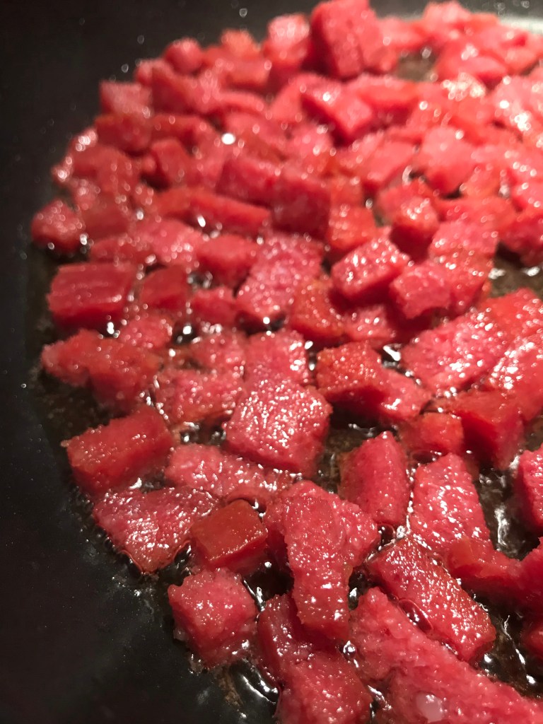 Verhit de olijfolie in een braadpan en bak de chorizoblokjes zachtjes uit tot ze krokant en bruin zijn.