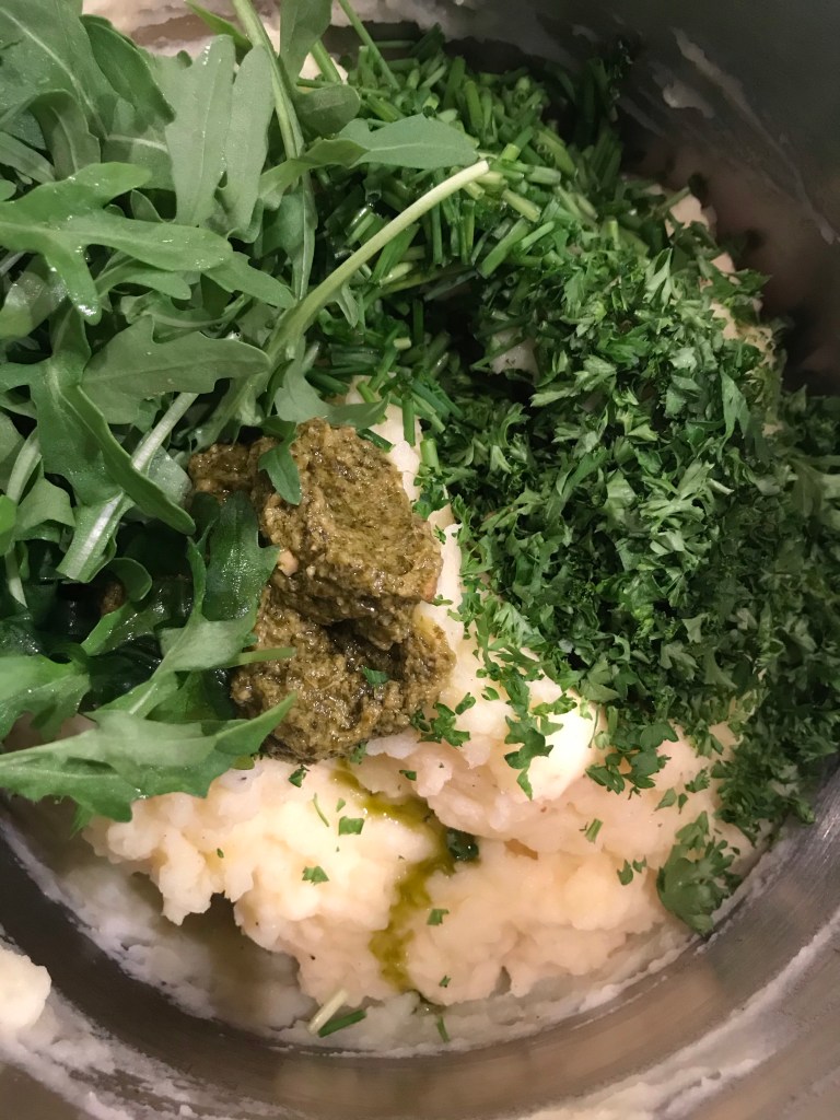 Schep de rucola, pesto ,peterselie en bieslook vlak voor het serveren door de puree.