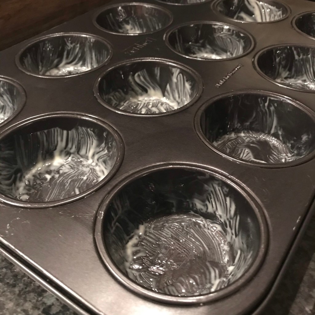 Verdeel dit mengsel, met een ijsschep,over een ingevette muffinvorm.
