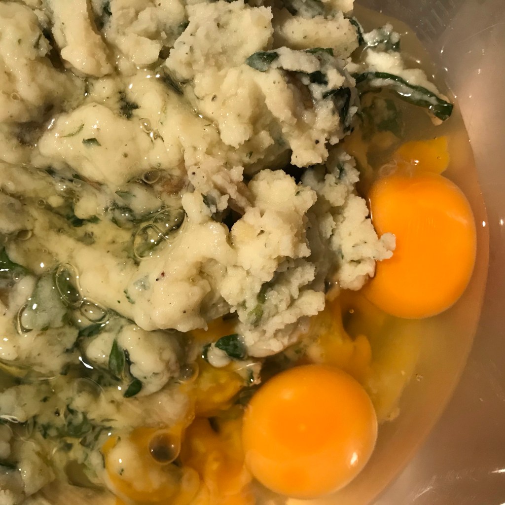 Je moet kijken hoeveel eieren je precies nodig hebt, dat hangt af van hoeveel stamppot je hebt en hoe groot/klein je eieren zijn, maar onthoud: liever een ei te veel dan een ei te weinig, daar worden je muffins lekker luchtig van.