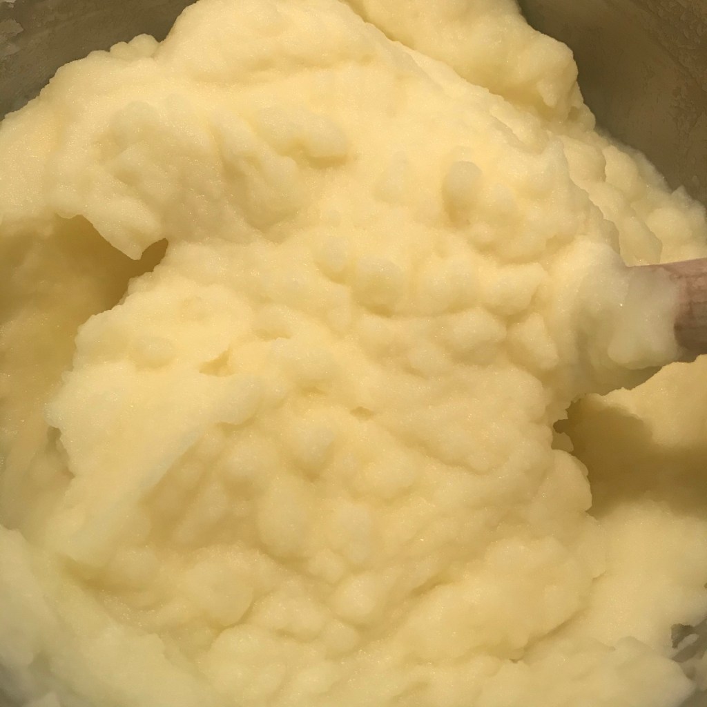 Stamp de aardappel met voldoende kookvocht tot een grove niet te natte puree.