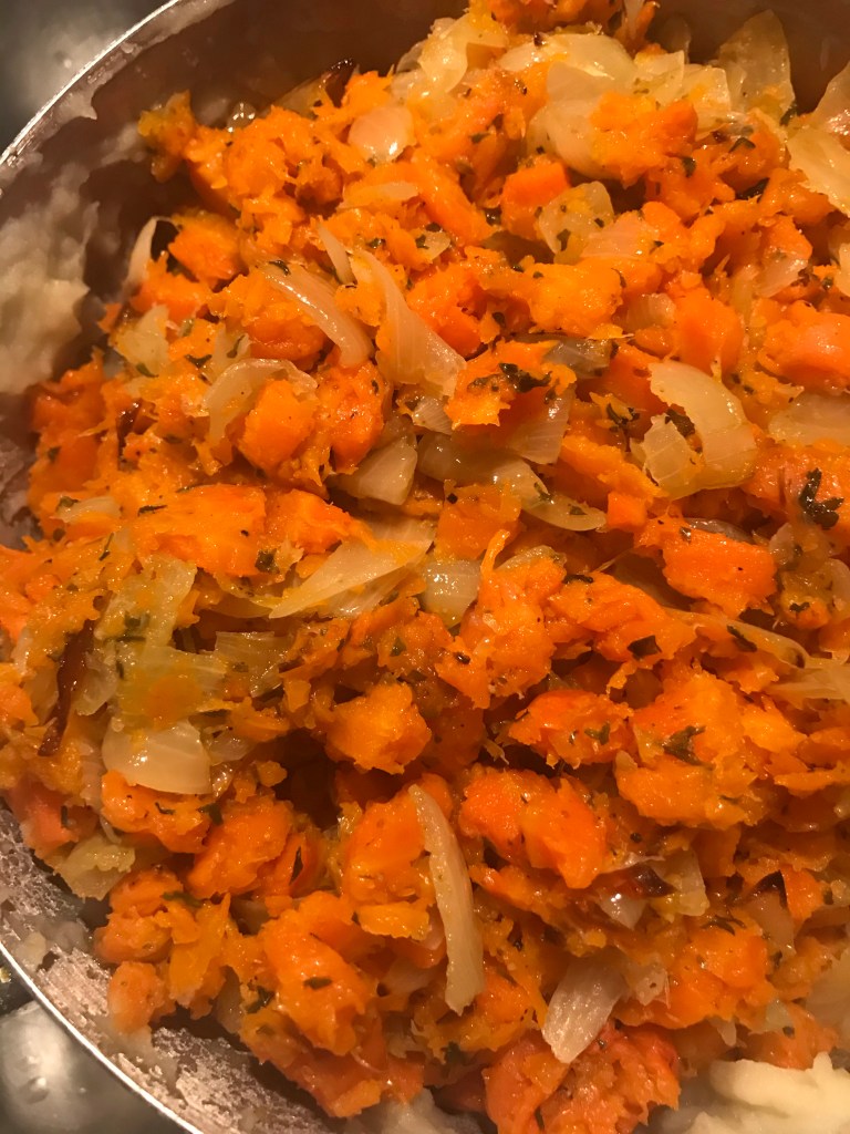 Voeg de geroosterde groenten toe en stamp ze nog kort door de puree met de roomboter.