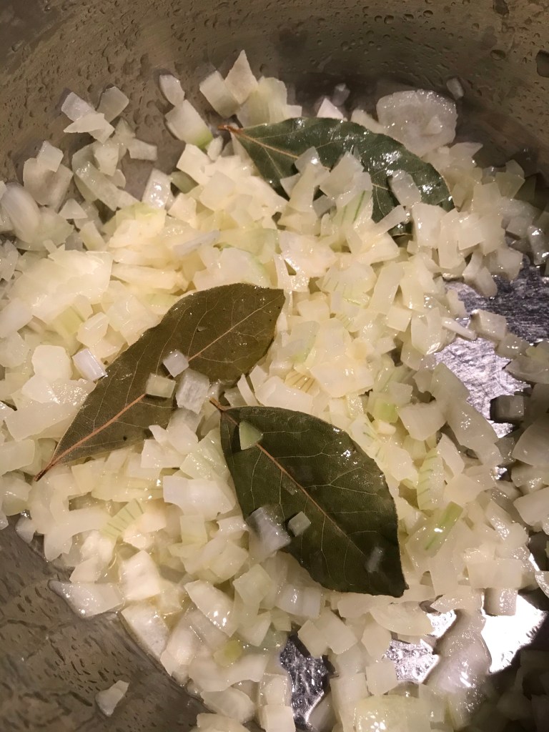 Verhit de boter in een soeppan en fruit de ui met de laurierblaadjes en de kruidnagel 10 min. op laag vuur.