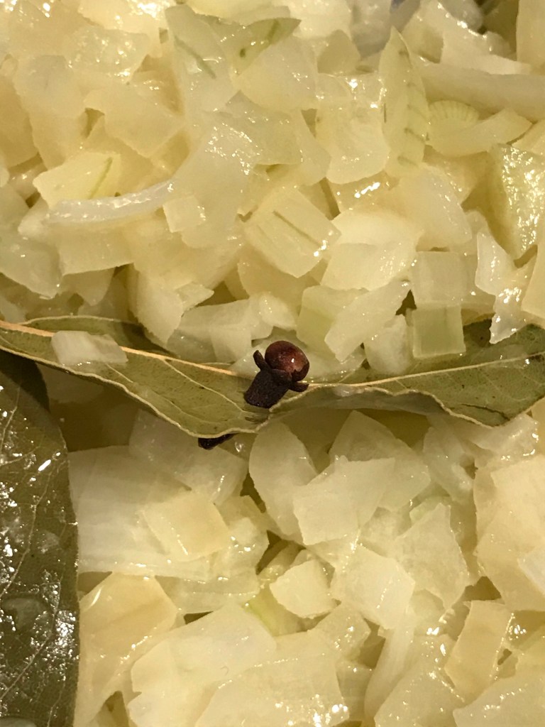 (Prik de kruidnagel in een laurierblaadje , zodat deze makkelijk is terug te vinden.)
