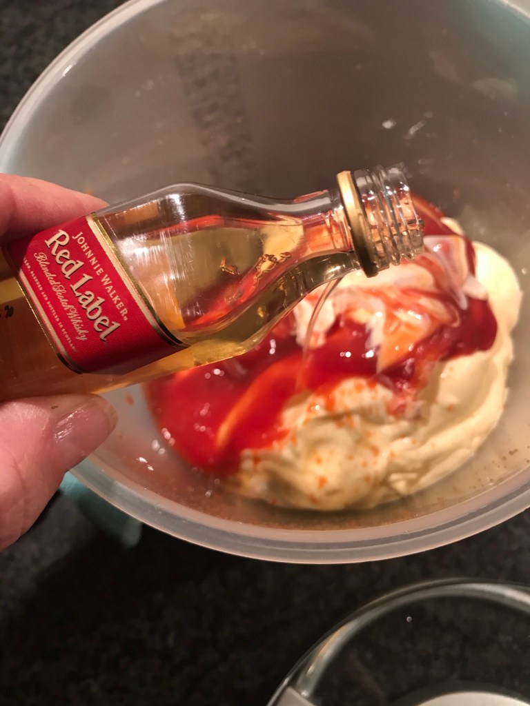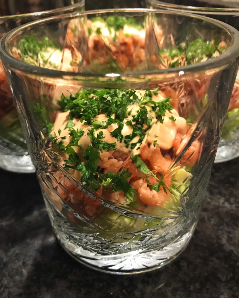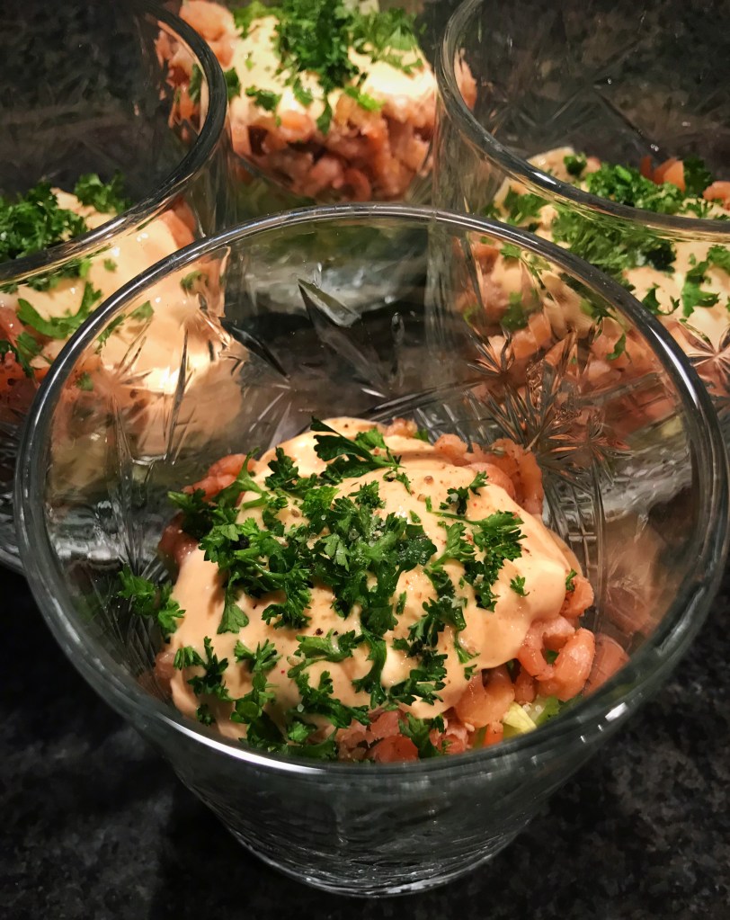 Meng de crème fraîche met de mayonaise, ketchup en whisky tot cocktailsaus.