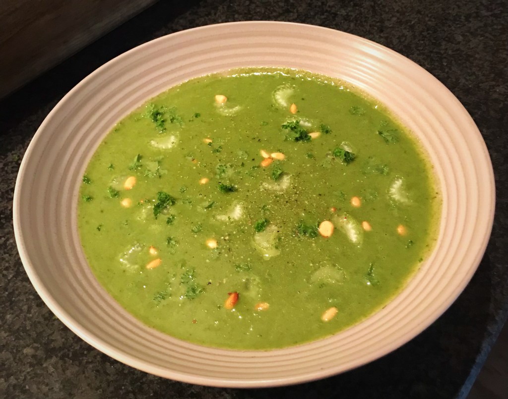 Garneer evt. met stukjes bleekselderij , pijnboompitten en peterselie of basilicum.