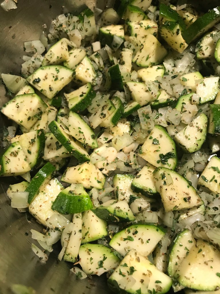 Snijd de courgette in blokjes en voeg deze met de Italiaanse kruiden toe aan de gefruite ui.