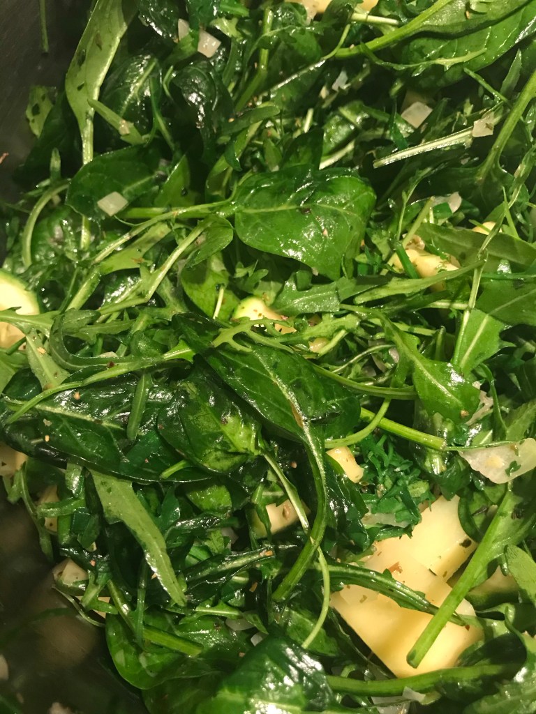 Na een paar minuutjes voeg je de spinazie en rucola toe.