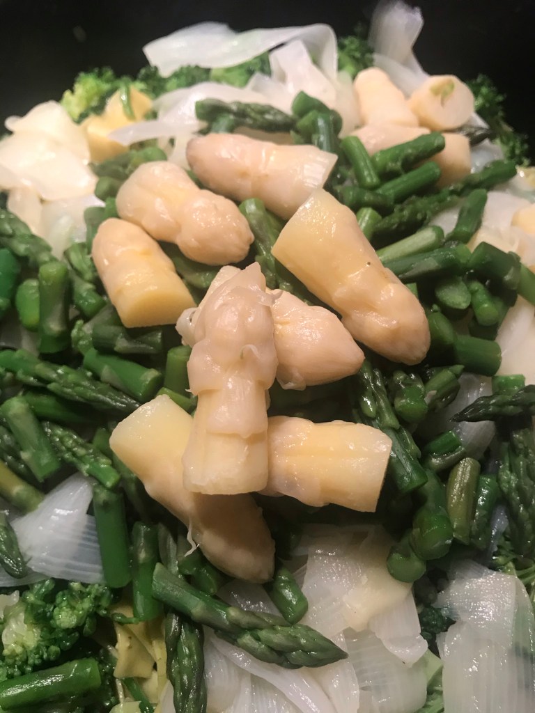 Voeg de prei en knoflook toe en bak 2 minuten mee .