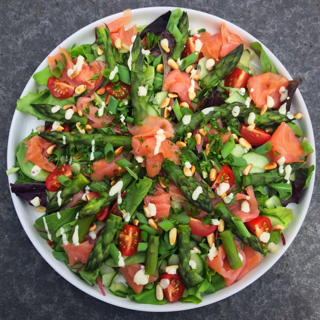 Snijd de asperges in grove stukken leg ze op de salade en strooi er dan de bosui en pijnboompitten over.